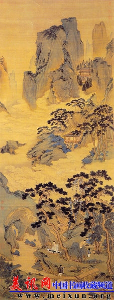 仇英,明代画家。字实父,号十洲,太仓(今属江苏)人,寓居苏州。后人将他与沈周、文徵明、唐寅并称为“明四家”。沈等都是文人出身的画家,而仇英只是一个民间画工,连生卒年都没有留下。少年时当过漆工,然而他学会了彩绘栋宇。画家周臣见了,觉得他有才赋,就收他为学生。所以他是唐寅的师弟,唐寅很器重他。而文徵明、祝允明也都是他的好友,过从甚密。这在中国绘画史中也是一个特例。一个画工,依靠自己的天赋、勤奋和努力,赢得文人画家的尊敬。而其画价也明显高于他人。他从文人朋友那里认识了中国绘画的传统,临摹了大量古代名画,几可乱真,尤其对古代青绿山水有独到的领悟。他从北宋后期复古派的大青绿山水入手,上溯唐人,又融入己意,所作的大青绿山水画可说是直逼古人。