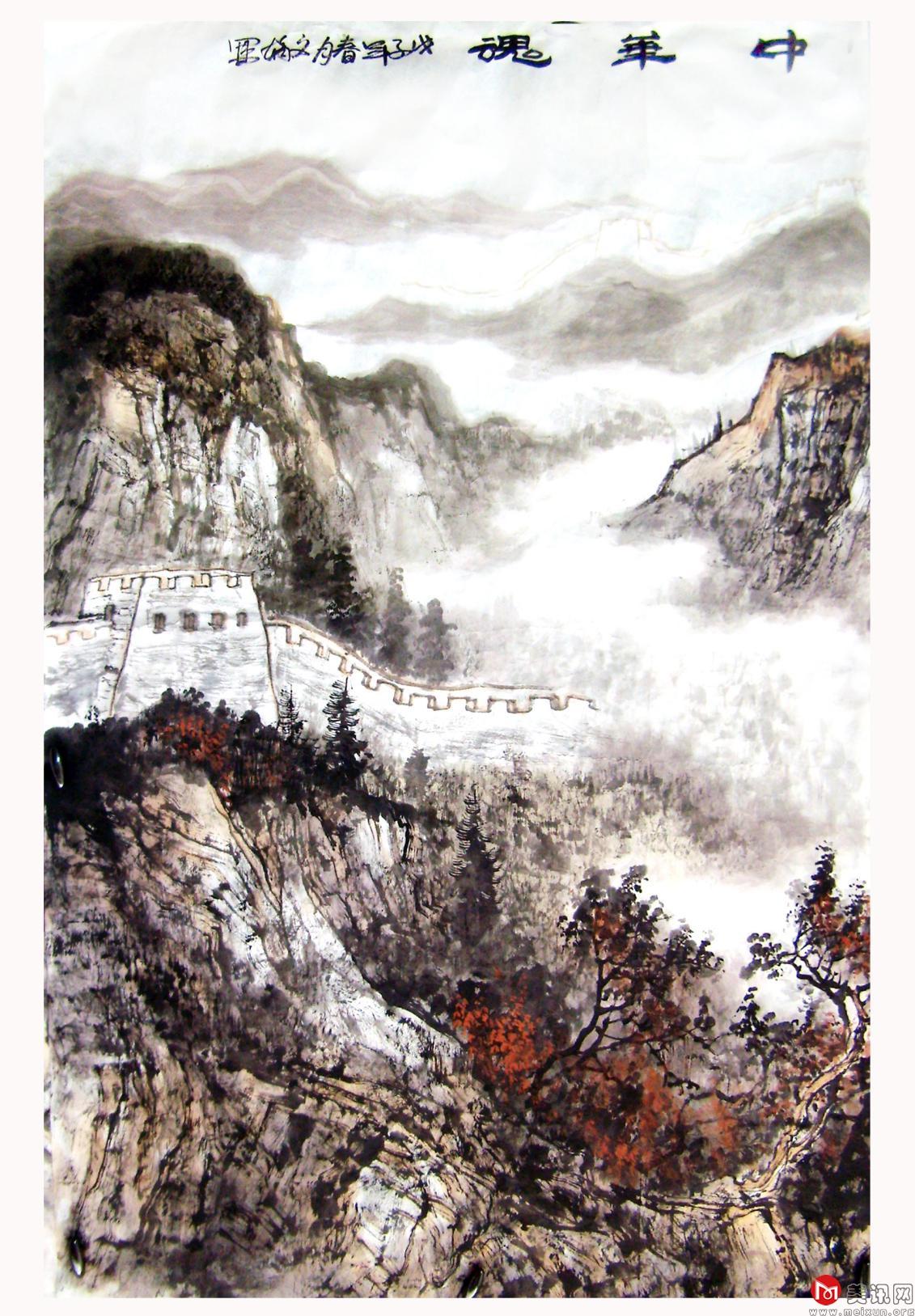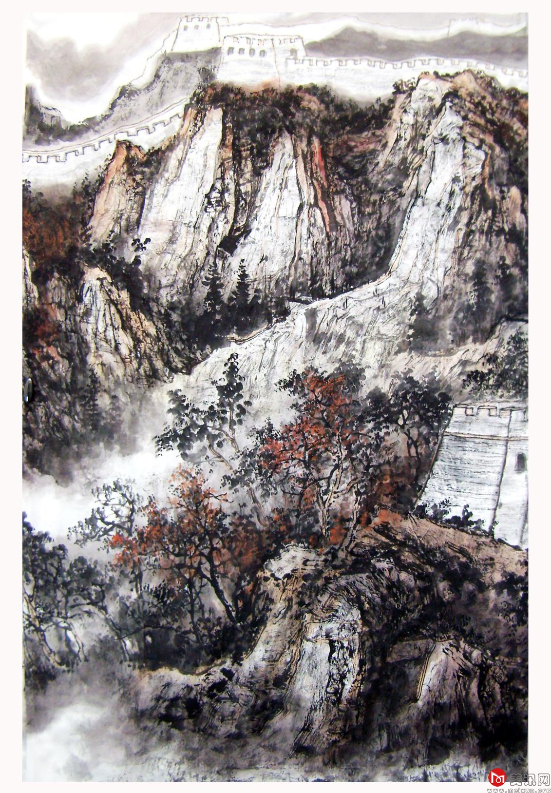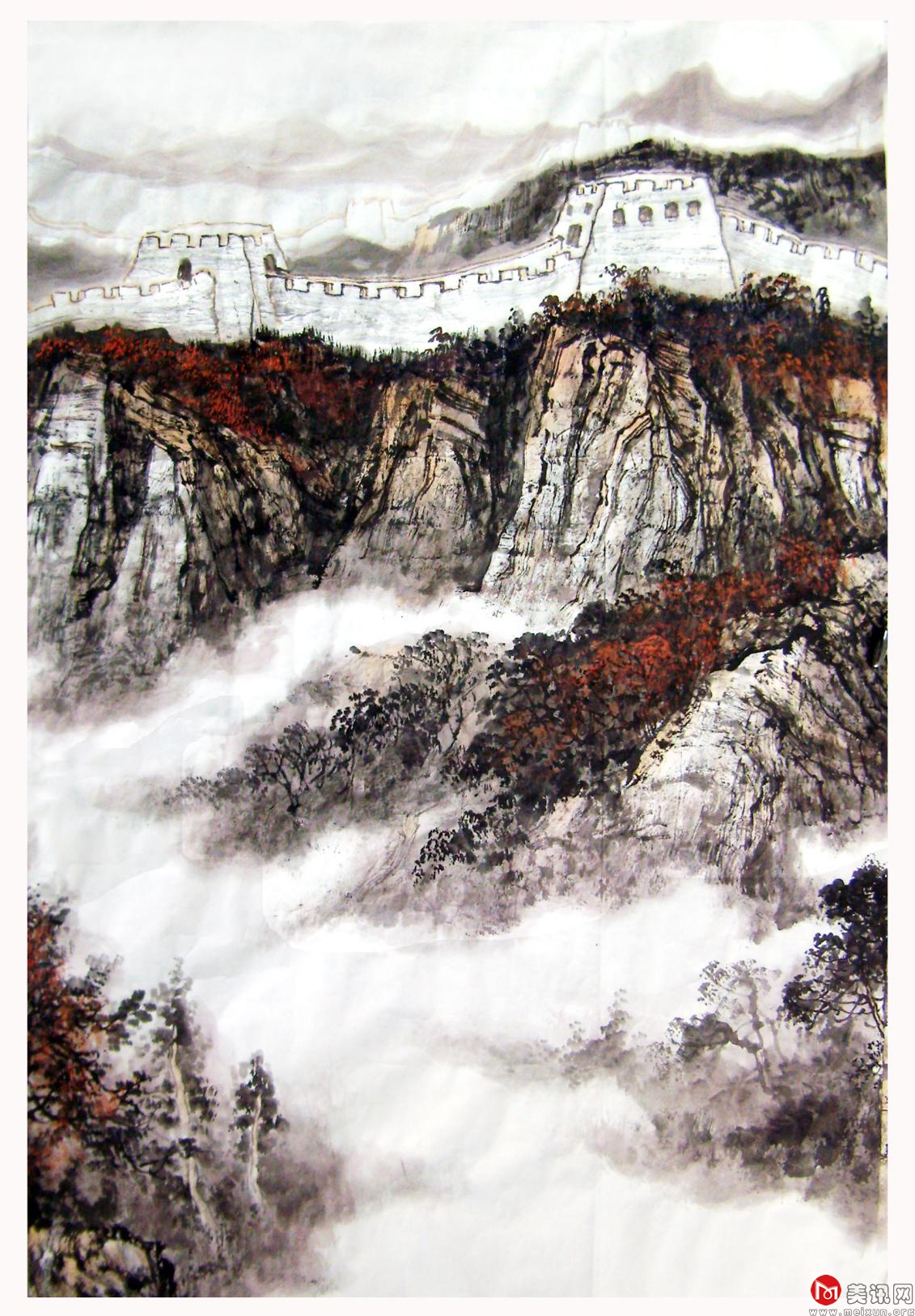 刘文嫡老师中华魂山水画作品,山峰雄伟陡峭山崖直立,山峰描绘细致,披麻皴描绘线条排列整齐更有真实之感,近处山峰附近的松树古朴苍劲生机勃勃,树木用水墨描绘,茂密富有活力;山间又有淡红色的植被点缀,增添了别样的色彩。灰色的长城描绘细致,台阶节节高升,寓意生活工作不断上升,长城随着山脊蜿蜒盘旋延伸向远方,远处的山峰简单勾勒,以淡红色渲染,和着云雾意境深远,山间云雾缭绕意境深远,一轮红日高悬风水寓意美好。整幅画描绘了开阔大气的边塞长城美景,雄伟壮阔色彩艳丽,精品山水国画作品!