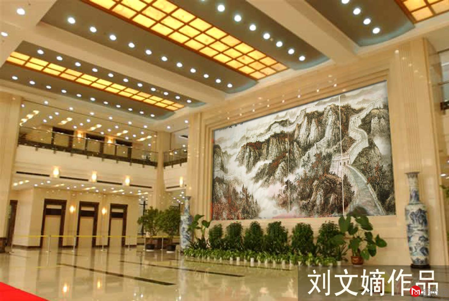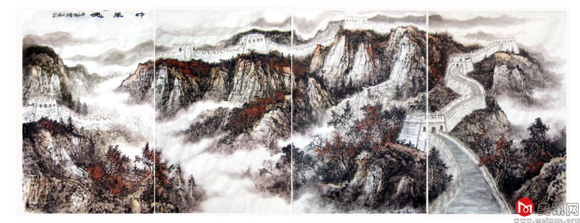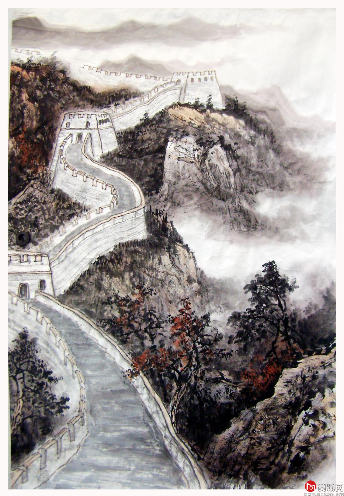 刘文嫡老师中华魂山水画作品,山峰雄伟陡峭山崖直立,山峰描绘细致,披麻皴描绘线条排列整齐更有真实之感,近处山峰附近的松树古朴苍劲生机勃勃,树木用水墨描绘,茂密富有活力;山间又有淡红色的植被点缀,增添了别样的色彩。灰色的长城描绘细致,台阶节节高升,寓意生活工作不断上升,长城随着山脊蜿蜒盘旋延伸向远方,远处的山峰简单勾勒,以淡红色渲染,和着云雾意境深远,山间云雾缭绕意境深远,一轮红日高悬风水寓意美好。整幅画描绘了开阔大气的边塞长城美景,雄伟壮阔色彩艳丽,精品山水国画作品!