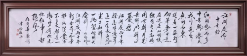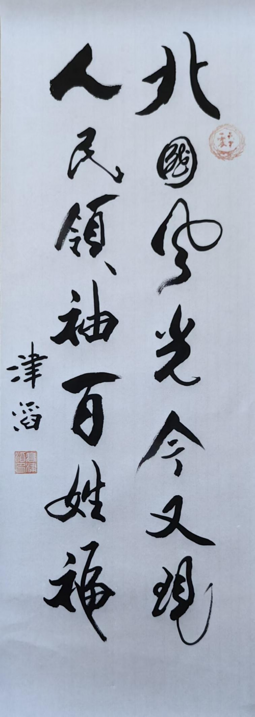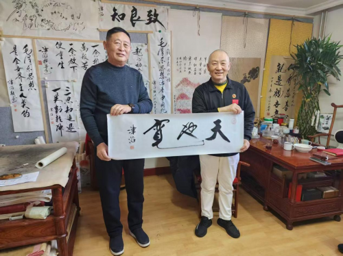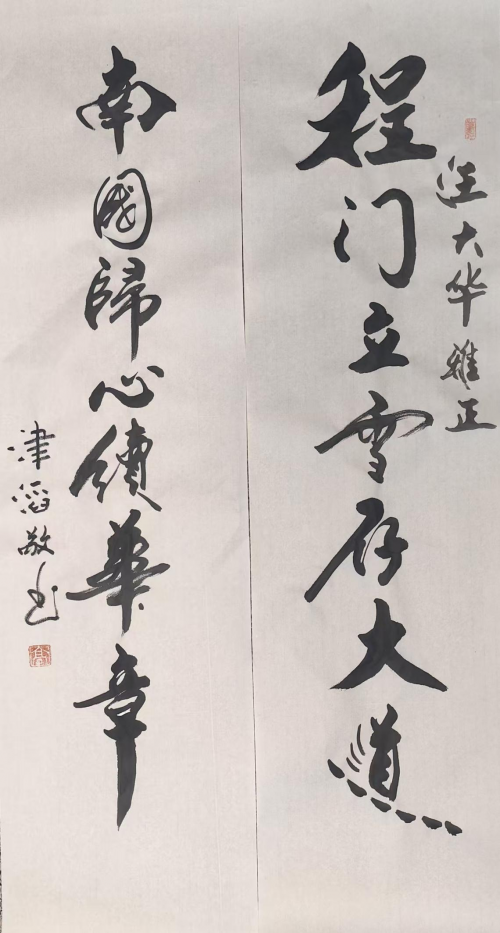 再看这幅对联,“程门立雪存大道”如磐石安坐,“立雪”的厚重里,是对传统的敬诚;“南国归心续华章”如鸿雁归巢,“归心”的圆转里,是“游子怀诚返乡、以初心续写荣光”的赤诚。从“程门立雪”的“敬师之诚”,到“红色传诚游子”的“归心之诚”,是“传统之‘诚’”与“当代之‘信’”的精神呼应——“敬诚”是把心交给先辈,“归心之诚”是把先辈的初心带回家园,先生用笔墨完成了“从‘敬诚’到‘传诚’”的闭环。