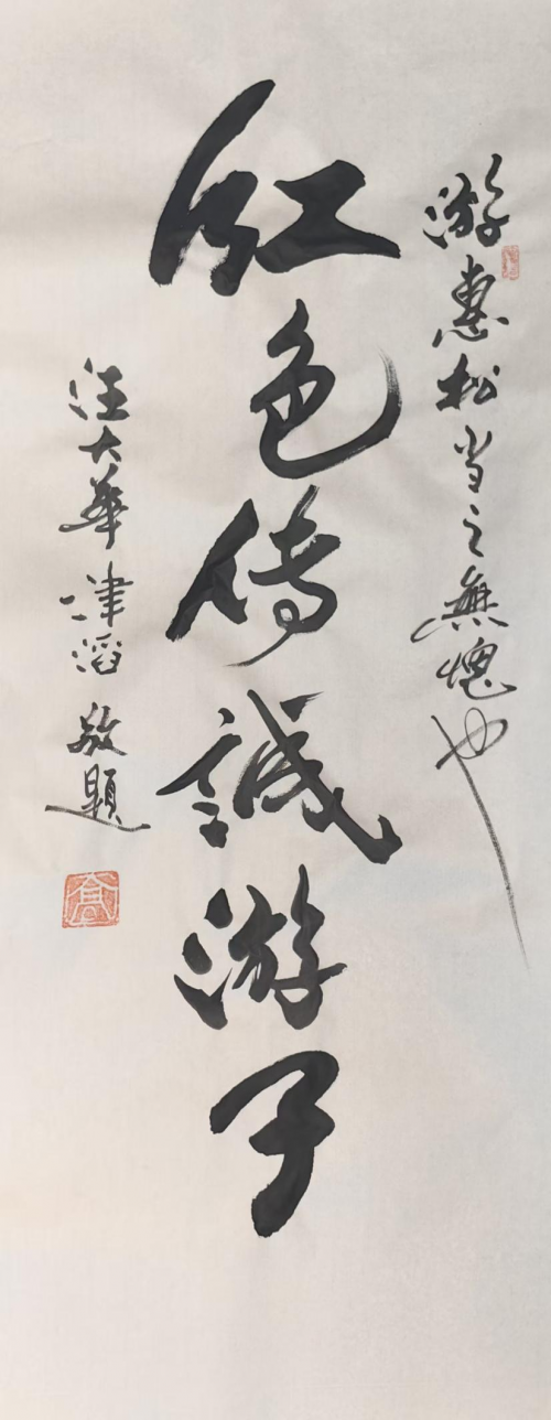 初见这幅竖幅,“红色”二字如丹砂燃纸,墨色里裹着先辈用生命写就的赤诚;“传诚”二字转折如金石叩心,枯笔飞白间藏着“以诚信传续根脉”的执着;末字“游子”一笔纵逸如长风过野,不是轻闲的游览,是“带着诚心上路、把红色种进山河”的坚定——这“传诚游子”,是把“红色里的诚”刻进骨血,用脚步丈量大地、用真心连接民心的“精神行者”,是让“传诚”从符号变成“活在人间的信仰”的践行者。