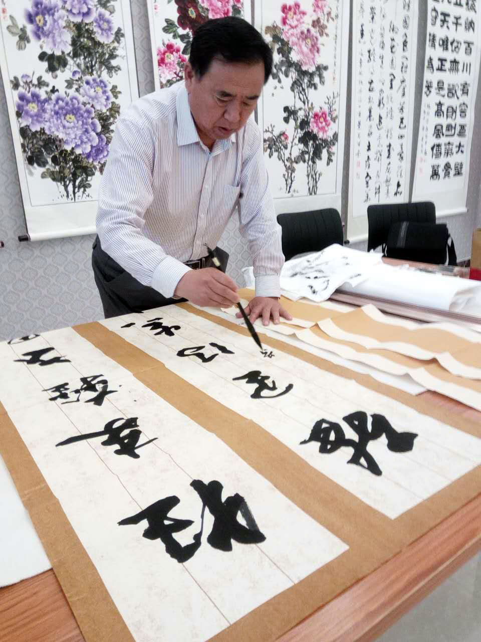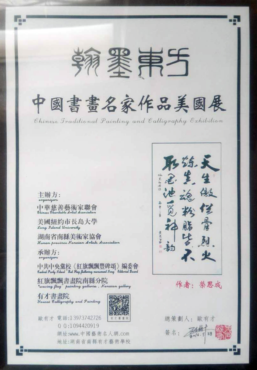 春有耕耘,秋有收获。在长期的书法学习中楷、行、草、隶兼攻。尤其以行、草、隶书擅长,形成了自己的风格。其书法作品曾多次参加全国、省、市书法大赛,共获奖28次,荣获特等奖、金奖、一等奖等殊荣,其中书法作品《江山如画》和《毛主席诗词浪淘沙•北戴河》被中央数字电视书画频道“迎新春美术书法作品展”分别在2013年2月9日和2014年1月11日展播;2013年4月10日,书法作品《墨舞神州》被“全国书画名家千米长卷”珍藏;2016年5月,书法作品《牡丹颂》被美国纽约长岛大学展出并永久珍藏;2017年,书法作品被中国邮政《不忘初心、继续前进— —十九大纪念》主题邮册发行限量版珍藏。部分作品被当地博物馆、书画院、企事业单位收藏。有十五幅书法作品在全国、省部级以上主要报刊上发表。