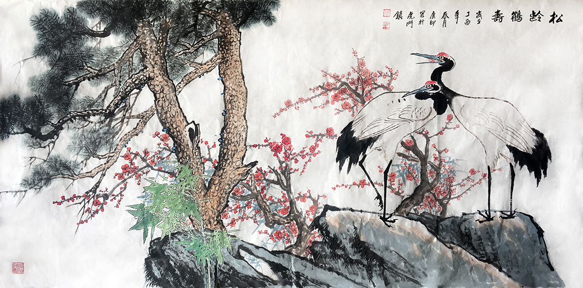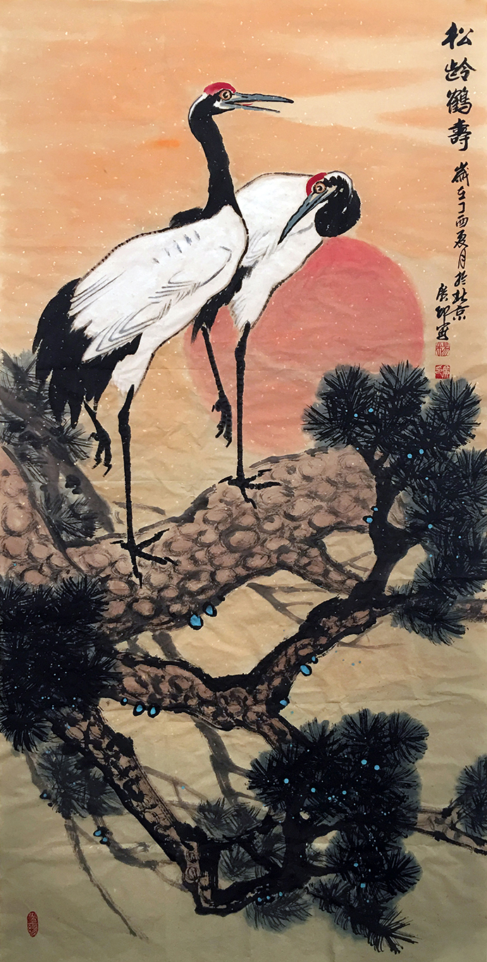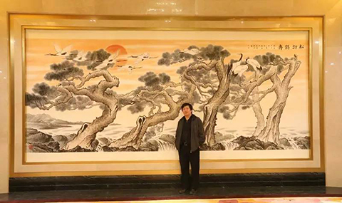(杨广印先生为全国总工会贵宾大厅绘制中国画巨作《松龄鹤寿》)
