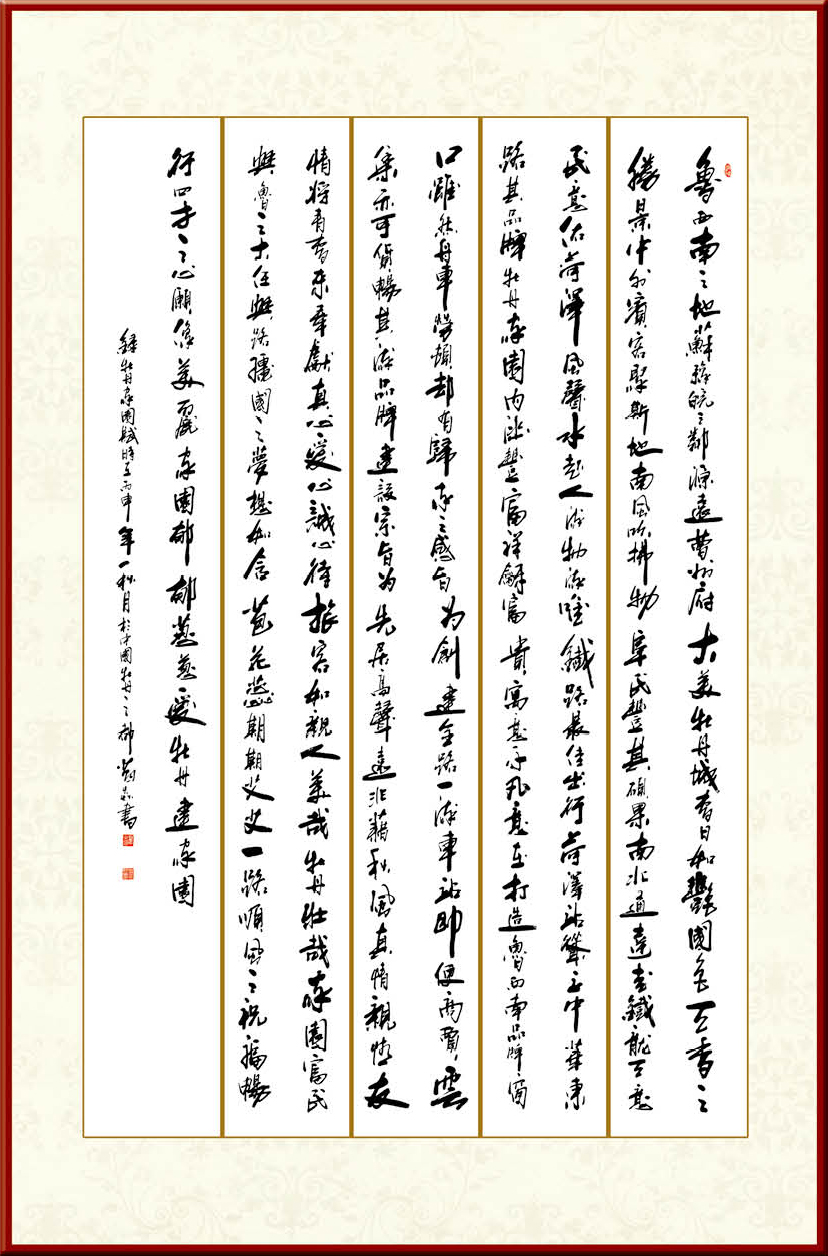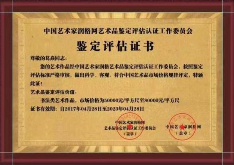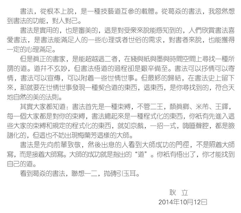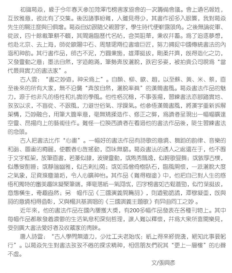 葛焱习练书法醉心于传统书法艺术,遍临历代名帖,尤以行书见长,兼学汉简、汉隶、魏碑等诸多书法名迹,兼收并蓄,自然融就。一字之中可见多种书体,笔墨酣畅,师古不泥。其作品风格造型美,字体雄浑挺拔,行笔奔放洒脱,提按使转运用自如,有一波三折之妙,笔画跌宕多姿,方圆兼施,刚柔并济,寓妍丽于苍劲之中,既不失传统又富于创新,展示出独特的艺术个性与风格,为当代实力派书法家。