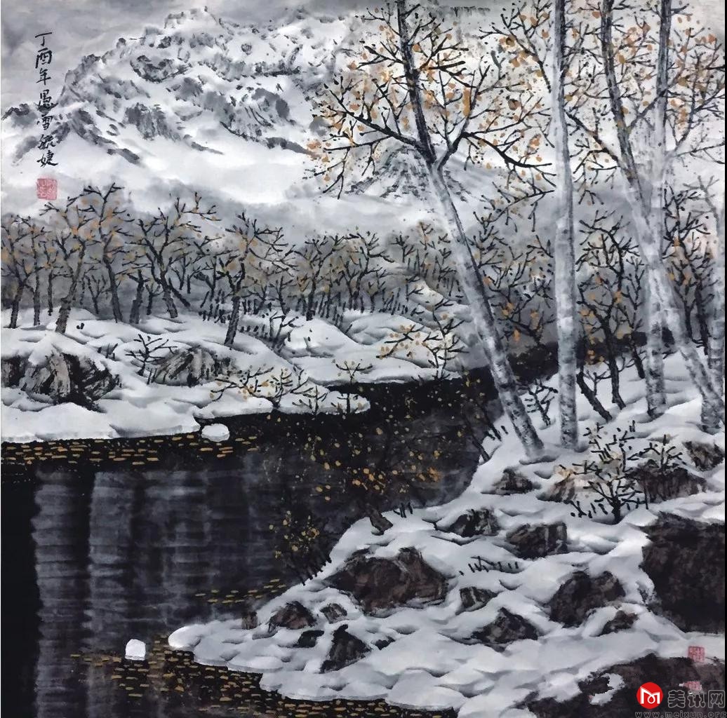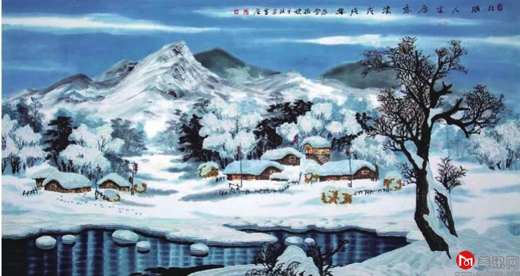 在中国传统绘画中,一年四季唯独只有雪景画独立出一个专门的分支,对后人产生极大的影响。据史书记载东晋顾恺之是最早用中国画表现雪景的画家。唐代《贞观公私画史》和《名画记》,介绍过一幅《雪霁望五老峰图》,说明一千六百多年前就开始对雪景进行过描绘,南朝·梁画家张僧繇曾画下传世之作《雪山红树图》。传统雪景画在唐代发展到了一个高峰,唐大诗人画家王维,运用丰富的联想和中国画的笔墨技巧,利用大面积渲染的“留白”,形成了积雪的清新、蓬松的感觉,令人耳目一新。唐以后各代画家都创作了大量的雪景作品。五代赵干在《江行初雪图》中首次应用“弹雪法”来对飞雪进行动态描绘,丰富了传统雪景画的表现手法。此后多年的雪景画虽然在表现形式和内容上有些变化,但在技法上却都没有什么突破。这种状态一直持续到现代。中国的雪景画尽管历史悠久,但只要稍加研究,便会发现另一个重大缺陷,那就是没有任何描绘“冰”的作品,在中国美术史上也没有发现对“冰”的质感的描写,而且传统雪景画中的“雪”,几乎都是“留白法”和传统的画山石的“山石法”来间接表现雪的状貌,这样就限制了传统雪景画的表现领域和表现题材。另外,古人的雪表现的大都是江南的雪,都是一种清寒、萧疏、寂寞的情调,完全没有北国的林海雪原,没有塞外的冰山雪川,无疑这是绘画史上的一个缺憾。