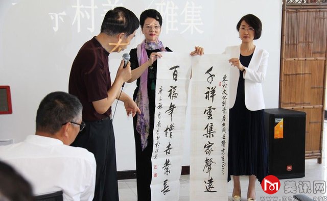 本次“国学传承 活力东村”美食雅集知识分享活动由国学导师、中国华服文化研究会秘书长苏轻评教授与上医文化传承人王会心老师主持,至善·合一行公益团队团长王一女士介绍了活动的缘起。《人生之问》作者、中华优秀出版物(图书)奖获得者、原解放军总装备部指挥学院副政委、著名军旅作家、书法家孙南京少将代表团队做了《疫情下的想念》主旨讲话,并代表团队向园区负责人赠送了书法作品,送上了“千祥云集家声远,百福年增世业长”的美好祝福。