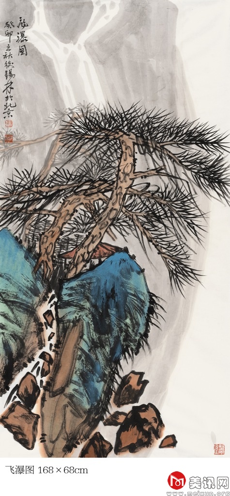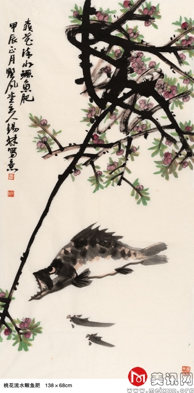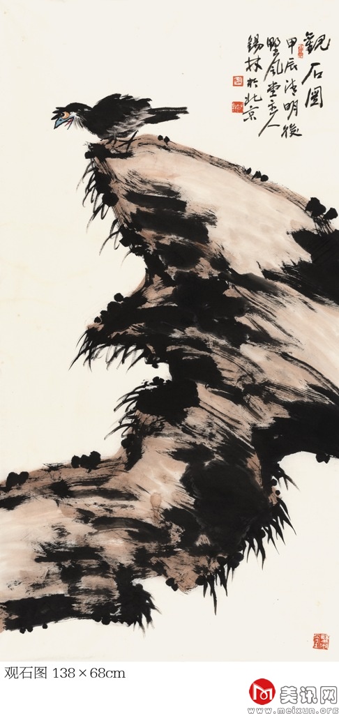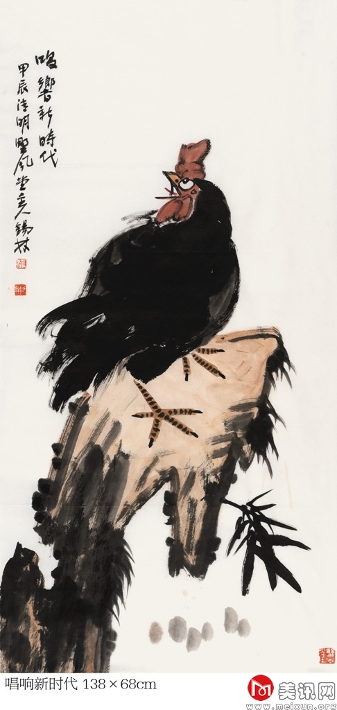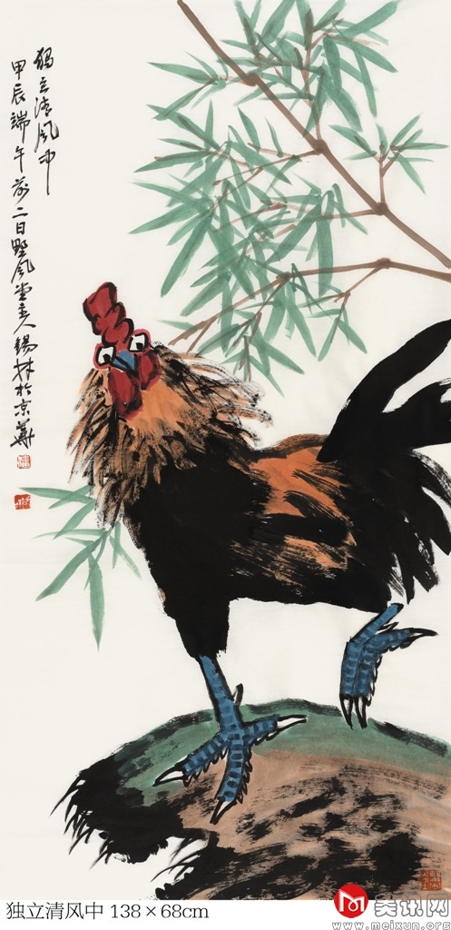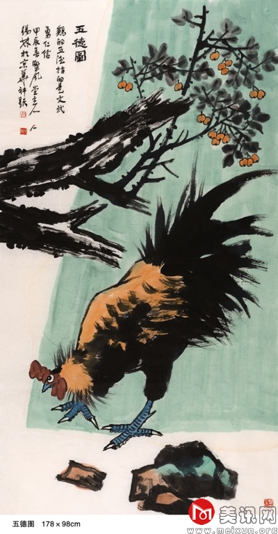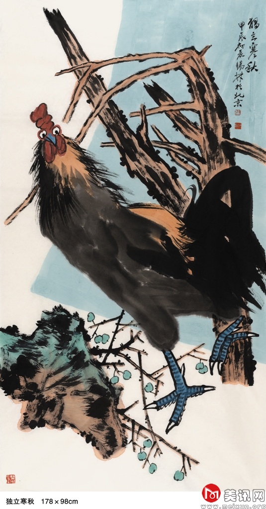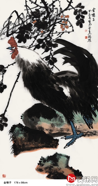 在中国古代文化中,孔雀被视为尊贵、纯洁的化身,受到文人和士大夫的青睐,提醒着世人保持贤德、端庄的行为举止。该幅作品呈现出一种静谧祥和的意境,赋予描绘对象生命的韵律与美的灵感。在创作实践中,他将传统写意之技法运用得灵活自如,能够熔皴擦点染于一炉,以丰腴沉着的水墨和飘逸劲健的线条率性而为、恣意挥洒。他画的孔雀,浓艳秀丽、翎羽分明,生动逼真、鲜活丰满。笔墨苍拙厚实、遒劲有力,这也正体现了他豪爽正直、胸襟坦荡的气质,以及从传统和自然中脱化而出的艺术才情。