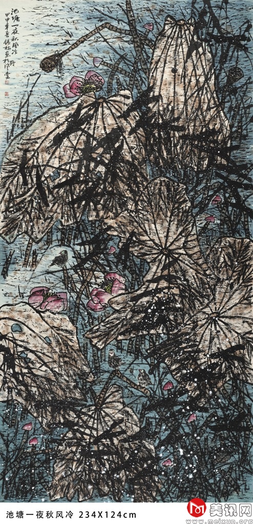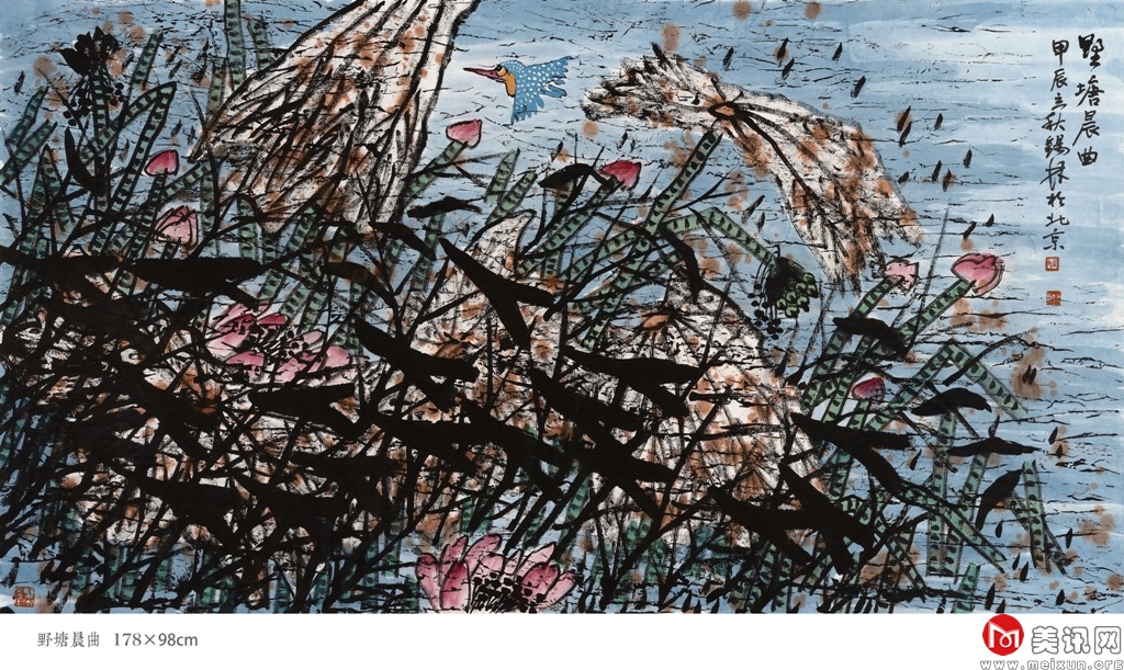其中,《野塘晨曲》荣获2024年度第三届莫奈国际艺术金奖。莫奈国际艺术奖具有深厚的历史和文化内涵,覆盖全球多个国家,是世界级权威性的艺术平台。《野塘晨曲》是潘锡林写意花鸟画代表作之一。荷花是潘锡林最得意的画题,也是他花功夫最多的题材,他将经历感受过的某种生活和境界融于画中,在他磅礴画风里总有无尽意趣。该幅作品以骨法用笔,把形似、骨气、立意、用笔之间的关系链接起来,形神兼备,妙在风雨“乱”荷塘的一个乱字上。此非混乱,而是万般趣味的生态本质,因此他被称为 “野荷”中国画创始人。