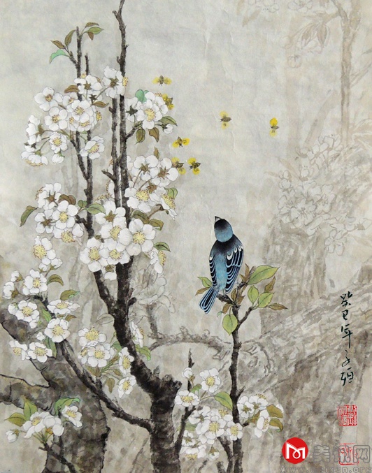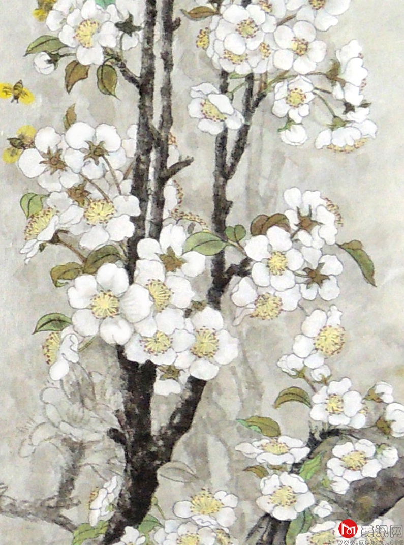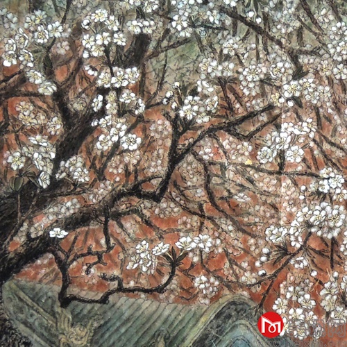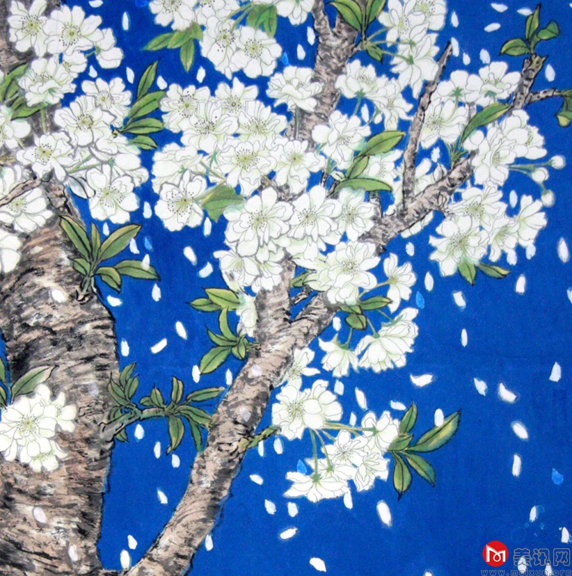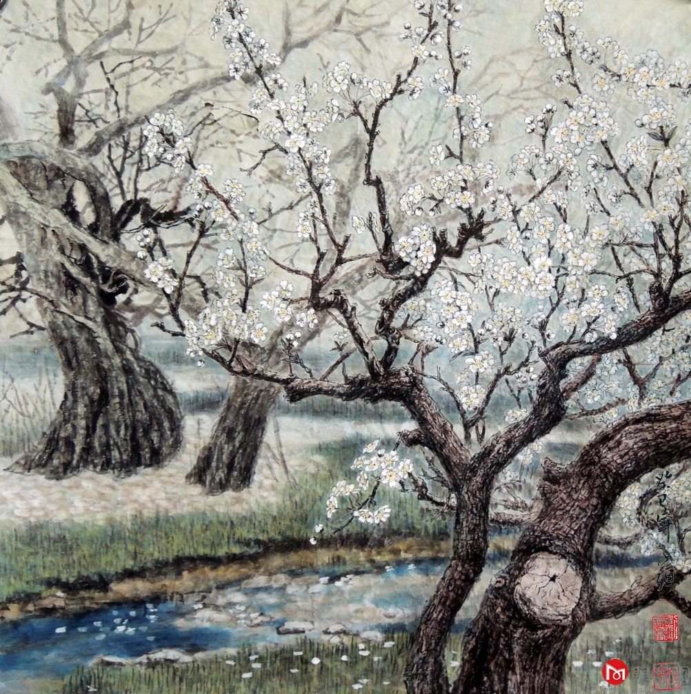 (这幅《梨花雨》师法与原莱阳梨树,在创作中特加了一条小河,增加诗情画意尔。)