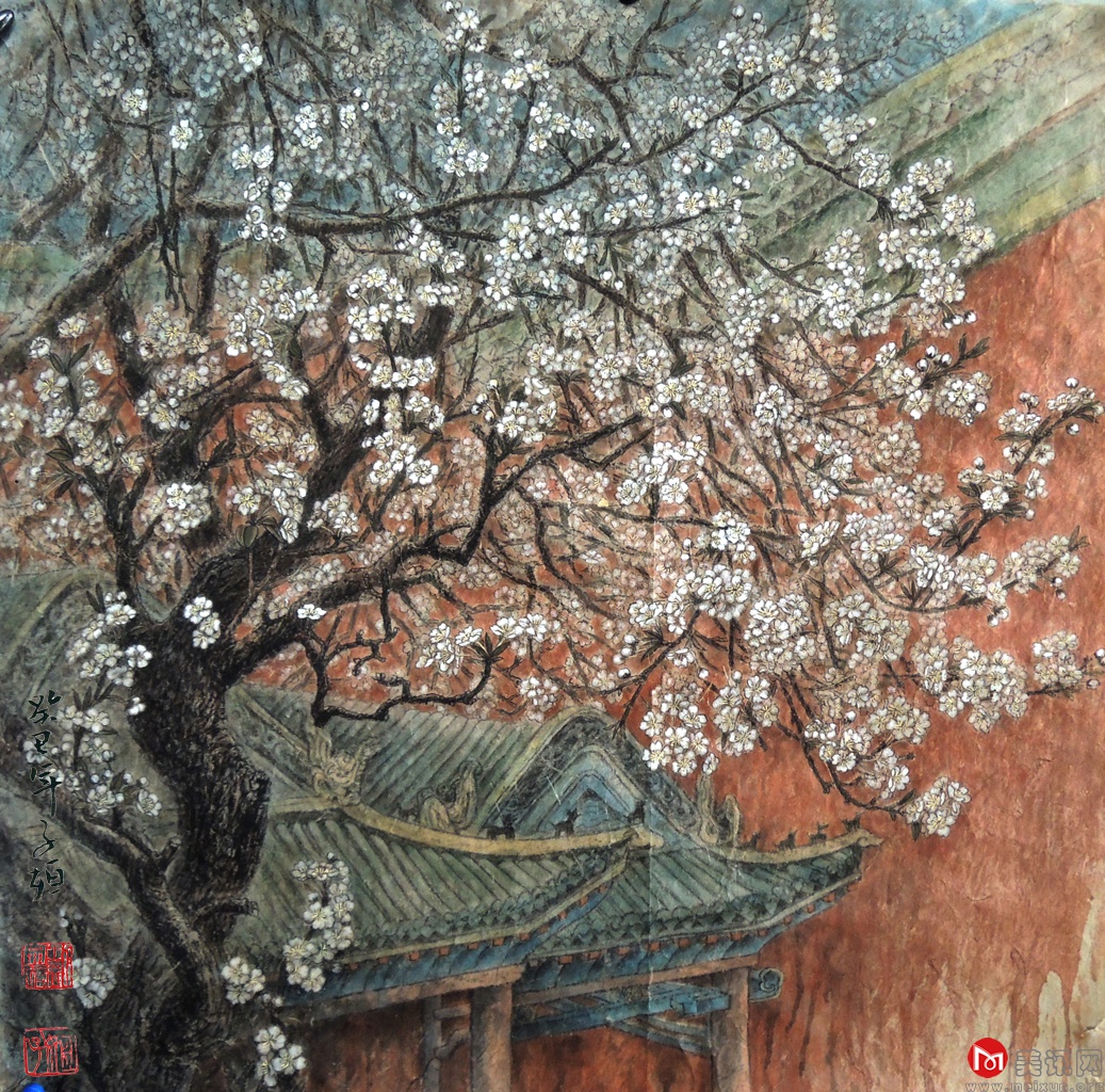 (可把莱阳梨花搬到庭院里来,用高贵的朱砂红调画出。有一番不同的情调.味道)