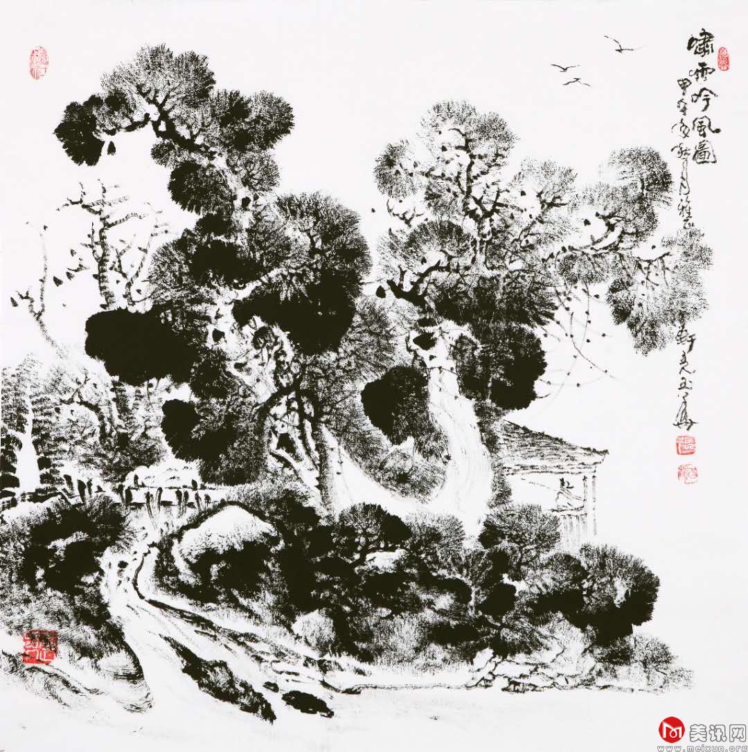“焦墨山水”作为一种中国画的技法,采用纯焦墨而不借助水的渗透作用作画。焦墨技法的难点,在于浓墨中不掺入任何水分,却使画面具有滋润感和层次感。焦墨是笔法精纯极致的表达,历代画家视为画道上的险绝,正如黄宾虹所说:“画有焦墨法,最为古朴,须笔力健举,含深秀为宜。 ”潘天寿认为:“用渴笔,须注意渴而能润,所谓干裂秋风,润含春雨是也。近代惟垢道人(程邃) 、个山僧,能得其秘奥,三四百年来,迄无人能突过之。 ”