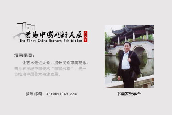 张学千名学谦,字耀进。望云轩主,生于1958年7月,江苏海门人,从小喜爱书画艺术,在师长的影响下,潜心学画,是83届中国书画函授大学毕业生。国画作品多次获奖,首届海门职工书画比赛国画类二等奖,硬笔书法入选中国硬笔书法精品大典,参加华夏情书画比赛获国画二等奖。是中国硬笔书法联谊会会员。