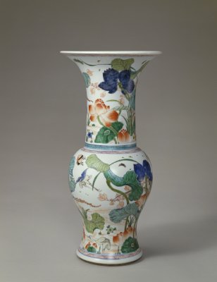 莲花因其“亭亭玉立”、“出淤泥而不染”之特性为人们所喜爱,明、清瓷器多以莲花为装饰。此尊器型秀美,色彩丰富,尤其是金彩的应用,使之愈显富丽堂皇。