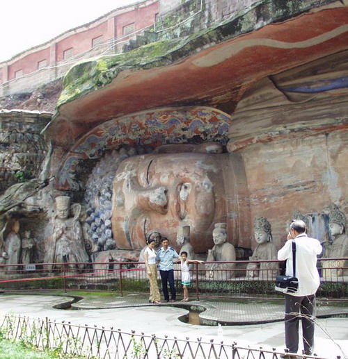 宝顶大佛湾南岩东端的三尊擎天柱般的立像,中为毗卢舍那像,左右为文殊、普贤二菩萨,合称"华严三圣"。"毗卢舍那"为梵文音译,
