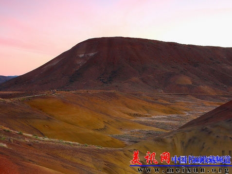 彩绘山,俄勒冈日出。俄勒冈州的彩绘山,在约翰时代化石床国家纪念区的彩绘山峰上看日出。