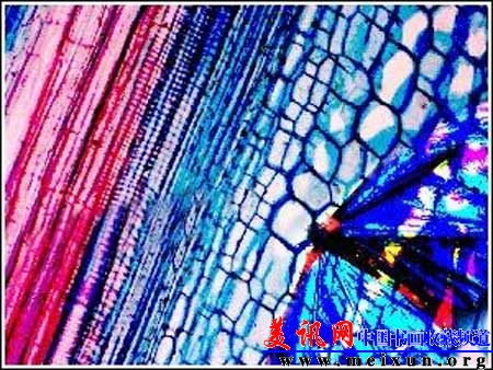 “植物茎干上的蝴蝶”年轻摄影师奖,16岁及以下:第1名“植物茎干上的蝴蝶”(Butterfly on a plant stem);作者:雷切尔·希尔库克(Rachel Shillcock)这张照片向人们展示了一株向日葵茎干上的多孔结构,其中包括红色的脉管区域和蓝色的支撑组织。这种系统的规律性和旁边一只蝴蝶的大体轮廓形成了对比。