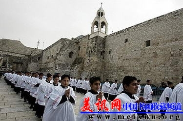 中新网12月25日电据法新社报道,罗马天主教耶路撒冷主教在他的年度圣诞布道中为“渴望和平”的圣地祈祷,他呼吁政治家们营造生命而不是死亡。图为巴勒斯坦儿童在伯利恒的主诞堂前举行传统的行进仪式。(春风)