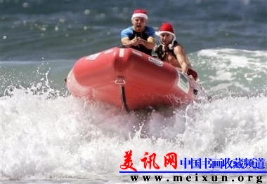 12月25日,头戴圣诞帽的冲浪救生员乘可充气救援艇在悉尼以北150公里的布鲁比角海滩巡逻。游客在圣诞日当天涌入海滩以享受28度的温暖夏日。圣诞前夕,当地的气温曾达到创纪录的42度。