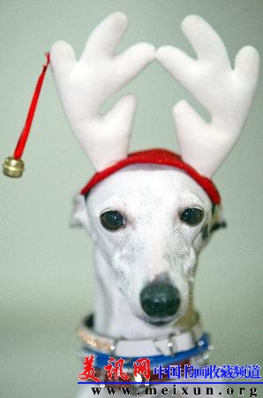 12月18日,在乌克兰首都基辅举办的国际犬类展览上,一只小狗打扮成圣诞驯鹿的模样,前来参展。