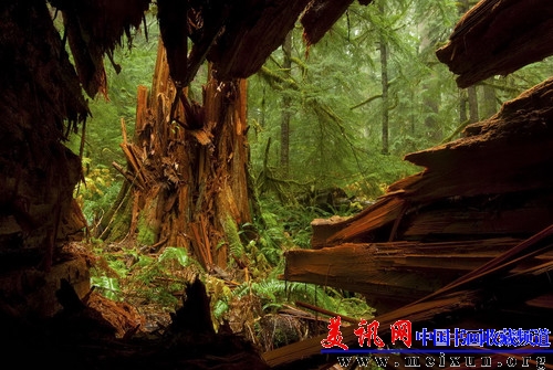 “利用景象中的一个元素构造另一个元素是一种效果强烈的创造手法。在瑞尼尔山国家公园的Carbon河谷徒步旅行中,我偶然碰到了这样一个机会。就在路旁,我发现一棵巨大的老树在经过暴风雨狂怒咆哮后倒下了,树根以上全部折断。这棵树足够我们从它的树干中间爬行通过。置身其中时,我采用了不同的视角进行创作,包括你现在所看到的这个。断开处锯齿形的边缘看上去正好指向它以前的根基。”