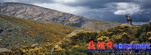 “格雷多山脉(Sierra de Gredos)是一个区域性公园,山脉主要由花岗岩组成,高度不超过2600米。该公园具有壮丽的景色,海拔最高达2000米。这幅照片是在初夏时期拍摄的,灰色岩石与生机勃勃的黄色花朵交相呼应。令我惊奇的是,这只雄鹿站在那,守护着这片山地,它依旧可以在这里平静地生活,而不会受到捕食者的威胁。而上空预示风暴的密云为这幅图增添了惊人的效果。”