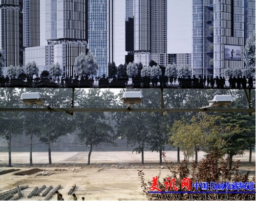东三环北路,国贸商圈北部一座临时广告牌展示将来综合商业区的效果图。