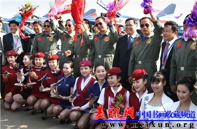 摄影大赛组委会领导、中航工业成都所领导、“八一”飞行表演队首长和十佳空乘合影。
