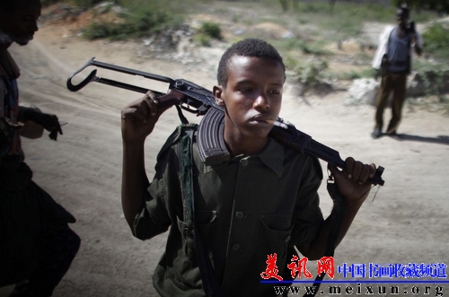 “索马里是全世界童军问题最严重的国家,根据联合国人权组织统计,目前索马里战场有超过数百名服役儿童,其中年龄最小的仅有9岁。让人难以想象的是,在这片土地上,得到美国政府资助的索马里政府军与那些最臭名昭着的叛乱组织进行了同样的选择────培训童军来进行杀戮。