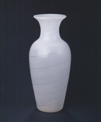 此瓶为吹制,壁薄体轻,材精形美。瓶身以白色与无色透明玻璃作装饰,清爽素雅。其纹理旋转流动,极富韵律美。这种装饰新奇独特,极为罕见。
