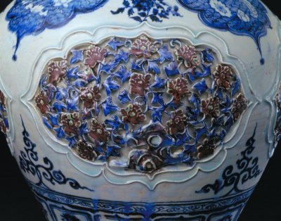 1965年在河北省保定市元代窖藏出土了这只漂亮的盖罐,它是元瓷中的稀世珍品。它综合运用了绘、塑、贴、镂等多种技法,而它的纹饰更是丰富多彩。罐盖顶部堆塑坐狮钮,钮下绘青花莲瓣纹、卷草纹、回纹各一周。罐身、口沿绘青花缠枝花纹、卷草纹各一周。肩部饰下垂如意云头纹,云纹内绘青花水波纹托白莲,云头纹间隔折枝牡丹纹。腹部四面贴双勾菱形开光,内镂雕山石、菊花、牡丹等四季园景,其中釉里红绘山石、花卉等,青花绘花叶,纹饰有浮雕效果。腹下部饰青花折枝莲花,与云头纹相对应。腹的底部饰卷草纹及变形莲瓣纹,莲瓣纹内绘倒垂宝相花纹。