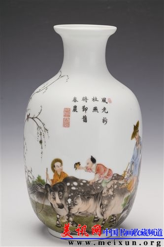 该物高20厘米,口径5.9厘米,腹径11.2厘米,足径6.3厘米。盘口,束颈,圆筒形腹下收,圈足。胎体细腻洁白,纹饰清新雅致。瓶子白釉上通体用珐琅彩画有三个孩童在春光明媚的郊外放牛。瓶一侧的上部墨彩书写唐朝诗人薛能的“风光新社燕,时节旧春农”诗句。右上方红彩画有朱文“仁和”椭圆形印款,左下方红料彩画有“德高”、“志远”两个长方形朱文印款。瓶外底有蓝料彩书的“乾隆年制”四字双行楷书款。