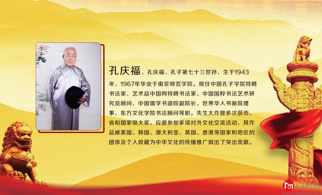 孔庆福,孔子第七十三世孙,生于1943年,1967年毕业于南京师范学院。现任中国孔子学院特聘书法家,艺术品中国网特聘书法家、中国国粹书法艺术研究员顾问,中国儒学书道院副院长,世界华人书画院理事,东方文化学院书法顾问等职。先生幼承家学,先随父亲开蒙临帖,后拜书法大家武中奇为师,得魏晋汉唐书家要旨;行追二王,草宗张怀,五十年来临池不辍,尤擅行,草,落笔奇伟,铁画银钩,法度严谨,古拙雄浑,尤有圣人遗泽之风。先生大作曾多次获市,省和国家级大奖,应邀参加多项对外文化交流活动,其作品被美国、韩国、澳大利亚、英国、香港等国家和地区的团体及个人收藏为中华文化的传播推广做出了突出贡献。