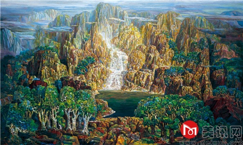 这种似网非网、大小不一的晶体块面,不仅分而不散,而且呈现出切割般的交错衔接。这里需要运用色调与光影的细微处理,取中国画中不同的线型、线性,通过颜料的不断堆积重叠以突现不同物象的质感、光感、体积感,构成了他的每一件作品耐读、耐看的重要元素。