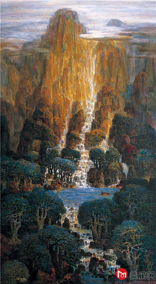 在油画创作方面,学习借鉴法国后印象主义代表画家乔治·修拉的“点彩”技法,探索性地将国画的线条与油画的色块、光影和细节处理方法进行融合,独创出“金属晶体”绘画技法:摒弃传统油画的大面积铺陈,撷取国画写意舒展的线条作“筋骨”,下笔有力、笔画短促、以方见多,借笔下苍劲的力道与简短精干的结构,赋予画中物象硬朗坚固的“金属”感。以笔为刀,对画面进行明确切割,并以油画斑斓绚烂的色块作肌肤,在平面上层层堆砌,形成如同钻石、水晶的立体结构;从整体出发,围绕不同的物象主题对色调和光影不断进行细微的调整,使得色块之间不断变化但又相互紧密连接,如“芯线”般迂回穿梭,呈现出“分而不散”的视觉效果,营造出各个角度之下均如“晶体”般通透、连贯的美感,形成辩证统一的画面逻辑。“金属晶体”技法的运用,可有效提升作品的张力,通过灵活调整金属晶体的大小、形状、色调和光影等因素,营造出或张或弛、或厚重或轻巧、或雄浑或通透等不同质感。