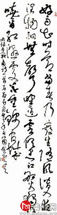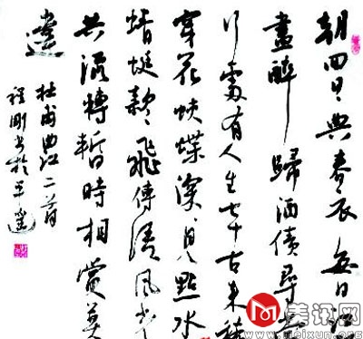 程刚以草书见长,章法上跌宕起伏,动感十足。行笔中呈现出抑扬顿挫的节奏,转折处清丽洒落,运笔屈曲回环,空间布白疏密有致,用笔枯润、收放均有讲究,凸显出丰富的层次性与强烈的视觉冲击力。