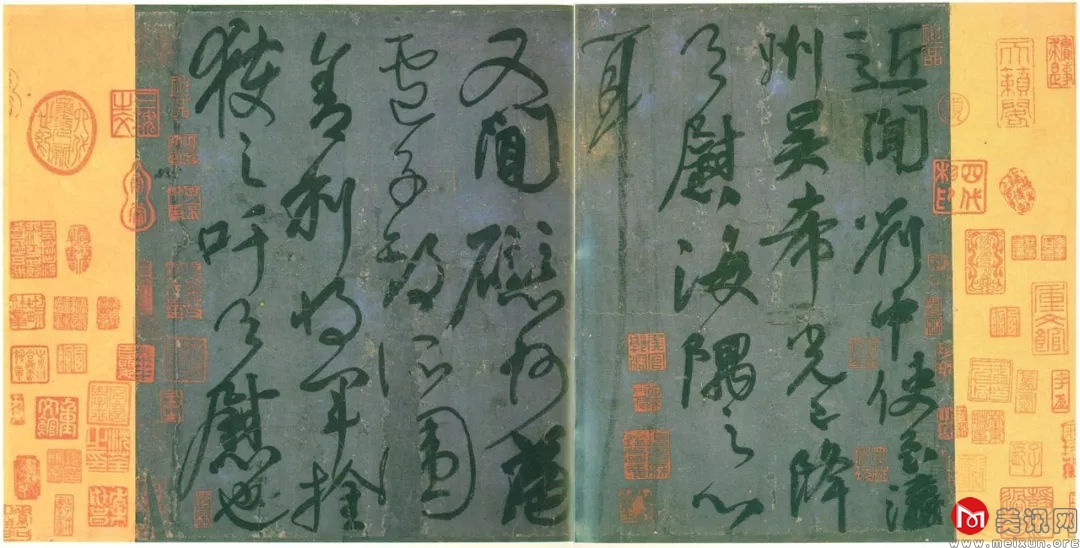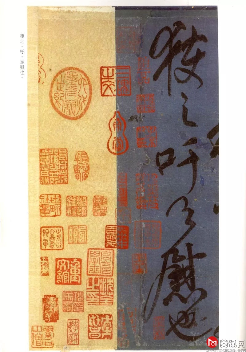 全帖气势磅礴, 笔力纵横矫健,呈现出一股英气豪爽之风度,运笔强劲秀拔,字与字之间的转笔处,时有牵丝实连,时有笔断意不断,运笔流畅,一气呵成。“耳”字末笔拖长竟占一行,其欣慰之情,借此线条一抒为快。且情无尽,意未完,故其下半篇之字比上半篇更大,如心之舒,而线条更加遒逸联绵。第五行二字相联,六行三字相联,七行四字相联,又似情激不已。