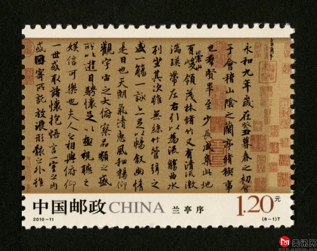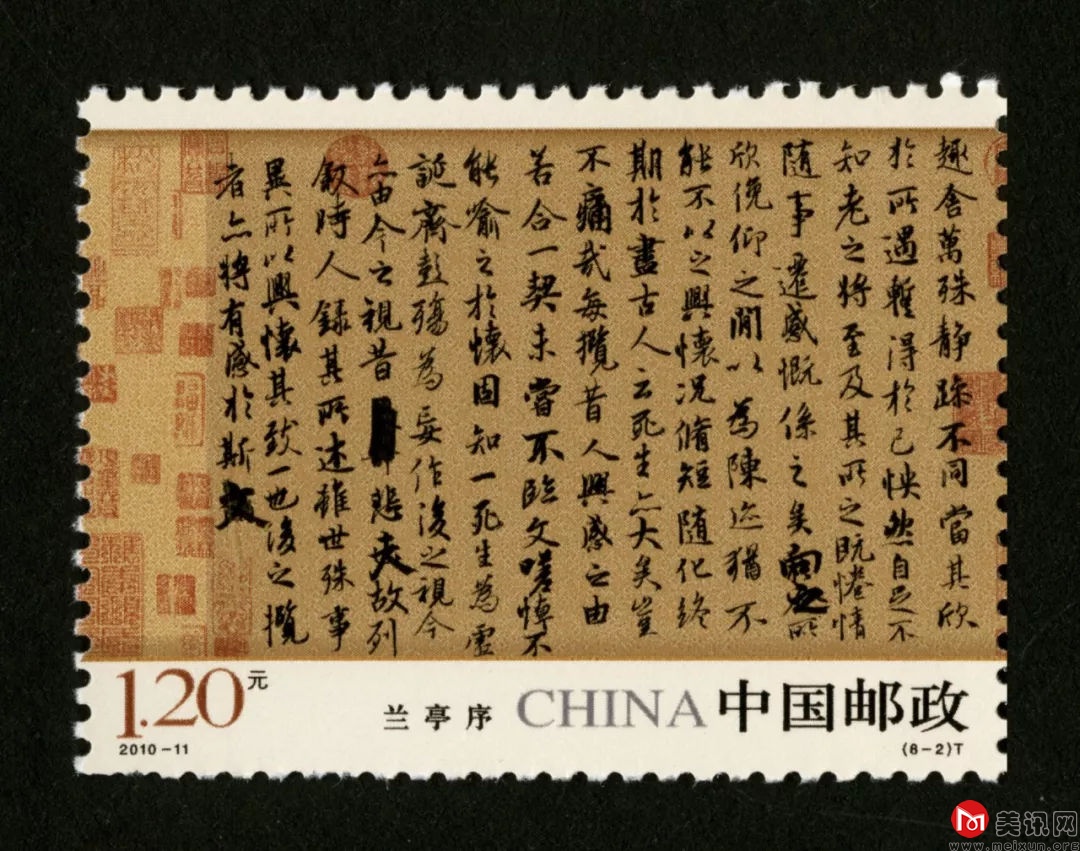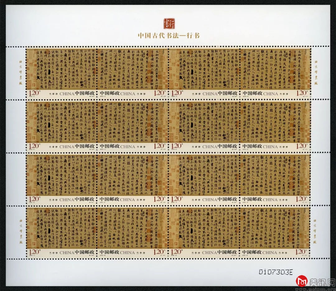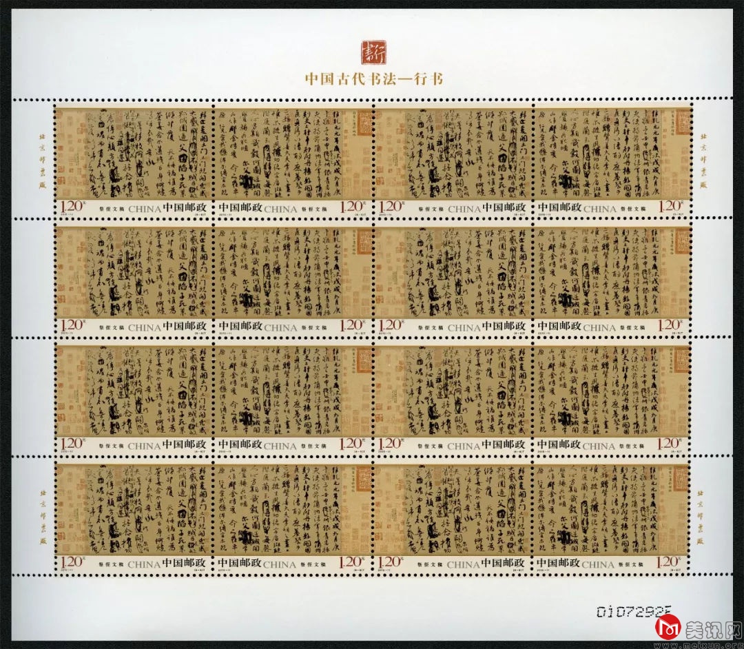 2010年5月15日国家邮政局发行《中国古代书法——行书》特种邮票1套6枚。每枚面值1.20元。在设计形式上采用两种版式,版式一为每一幅行书采用两枚连票印制;版式二为小全张,2套12枚。其中,版式二采用传统手工宣纸印制,全球限量发行。内容选取了天下三大行书,分别为东晋书法家王羲之的《兰亭序》(局部)、唐颜真卿所书《祭侄文稿》(局部)和宋苏轼的《黄州寒食帖》(局部)。