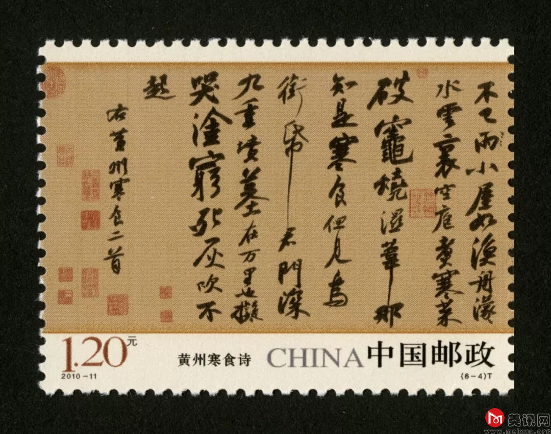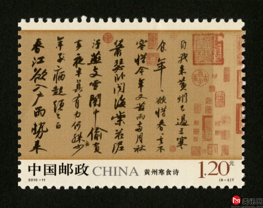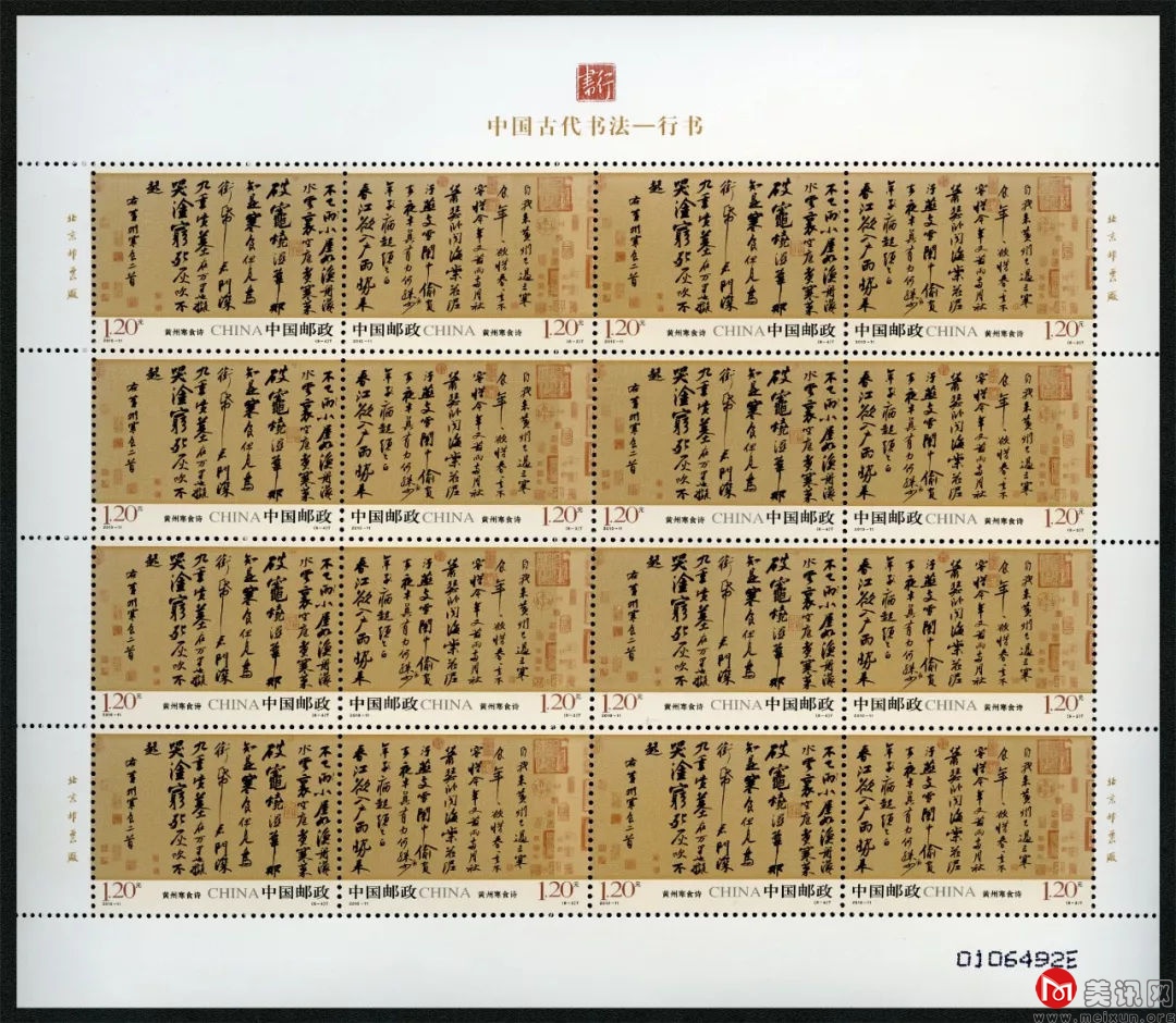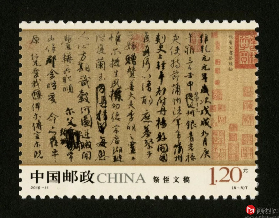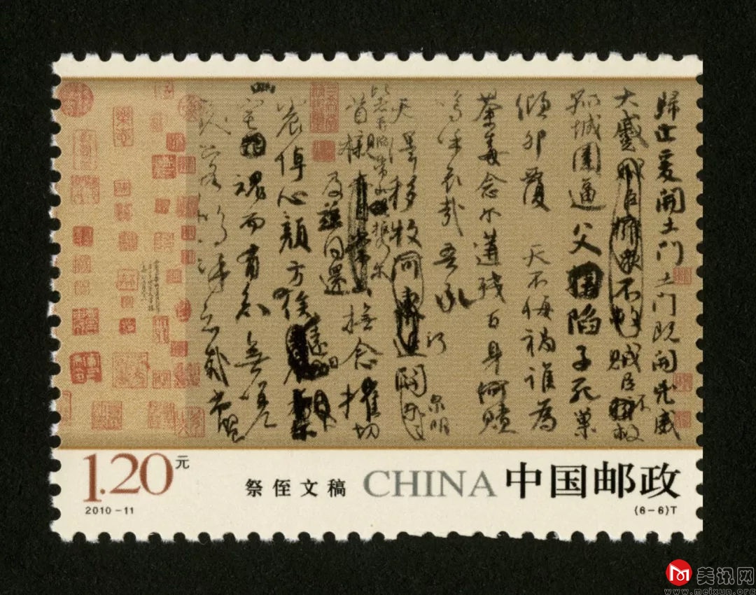 2010年5月15日国家邮政局发行《中国古代书法——行书》特种邮票1套6枚。每枚面值1.20元。在设计形式上采用两种版式,版式一为每一幅行书采用两枚连票印制;版式二为小全张,2套12枚。其中,版式二采用传统手工宣纸印制,全球限量发行。内容选取了天下三大行书,分别为东晋书法家王羲之的《兰亭序》(局部)、唐颜真卿所书《祭侄文稿》(局部)和宋苏轼的《黄州寒食帖》(局部)。