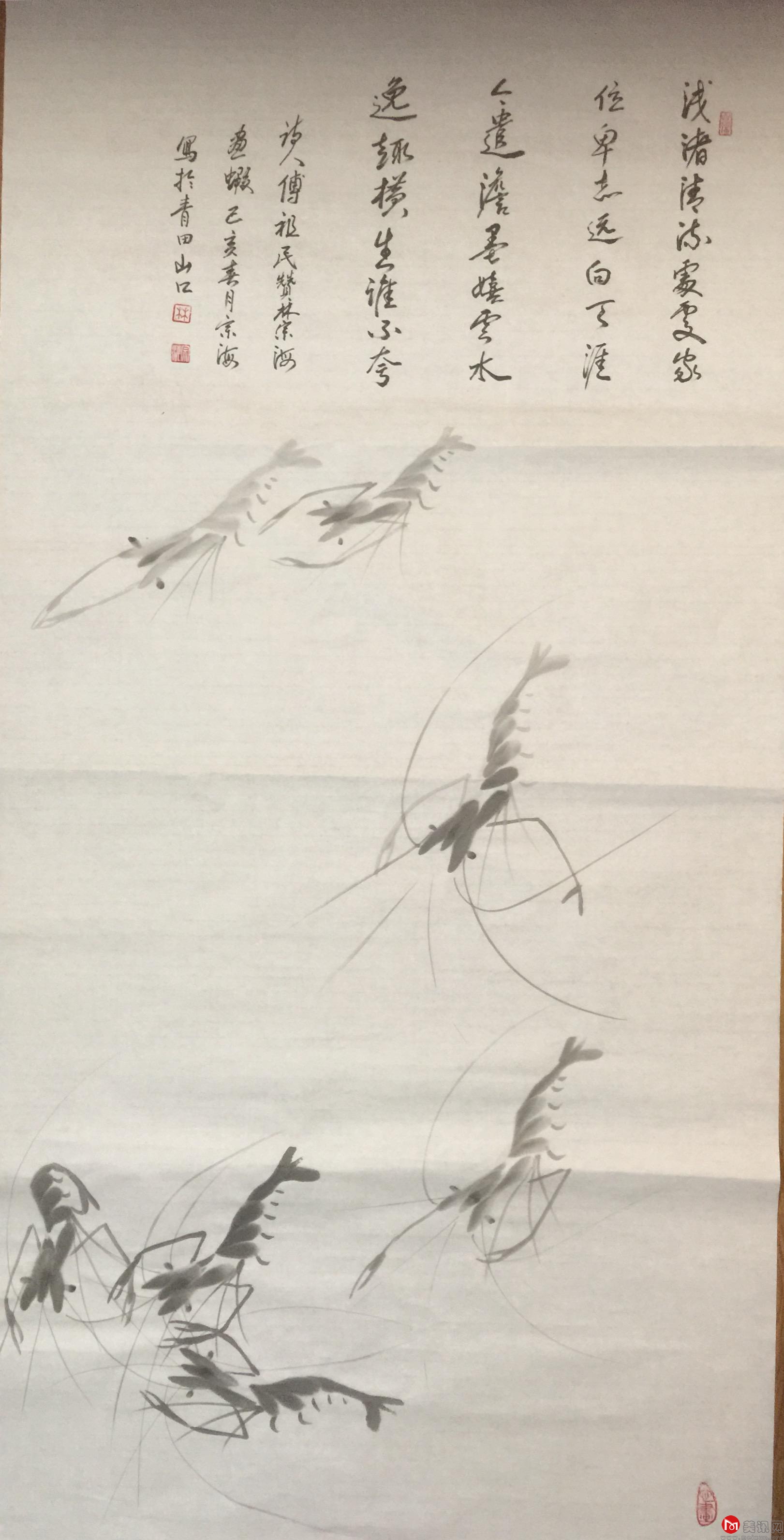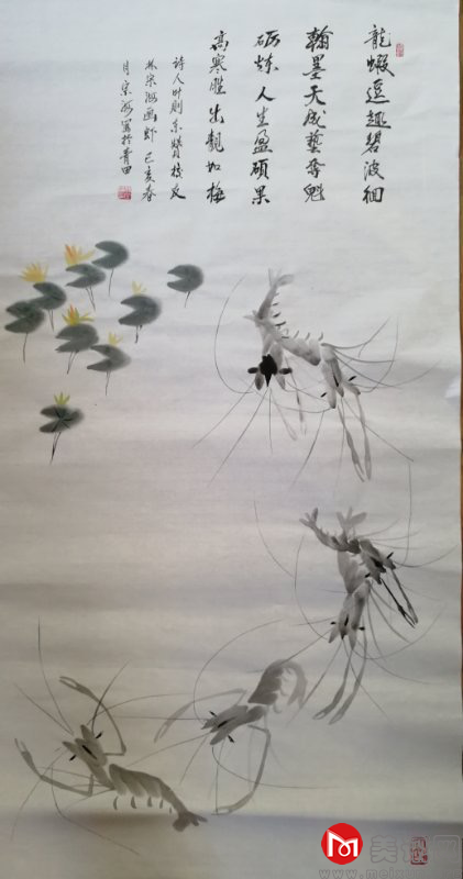 此作色调谈雅,线条流畅,把河虾在水中畅游的姿势表现的活灵活现,配上诗人对作品的赞美,使作品更具欣赏价值。