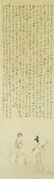 《琵琶行图》是根据唐代着名诗人白居易《琵琶行》诗意创作的写意人物画,表现白居易与歌女邂逅的情景。构图新颖奇特,占画幅2/3篇幅的《琵琶行》诗为行草体书写,纵向取势,参差布白,极具宽窄长短之变化;结字笔画纵横奔放,或断或连,枯润纤秾皆在章法之中。画面削尽繁冗,没有任何晕染,仅以简约明了的圆熟线条勾画出诗人与落难中的歌女,形象高度提炼,笔墨大胆精减,却将画中人物“听”与“说”的神态表现得有声有色,极具感染力,展示出作者于人物画创作上形简神足的深厚功底。此外,诗题在画幅中起到了令画面充实、平衡、布局更完美的作用,犹如人物活动的衬景,填补了人物上方大片的空白,并通过字距、字体结构的诸多变化扩展了画面的纵深空间,那奔流直下、一泻千里的磅礴气势也令画面清逸儒雅的意境增添了气魄与力度,从而增强了全画的艺术感染力。