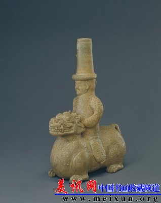 人骑于兽背,双手握兽角,头戴网纹卷沿高帽,帽中空,可插烛。骑兽人高鼻圆眼,颌下有须;兽则伏卧,龇牙瞋目。人、兽之身都戳印圆形纹,兽面篦划须纹,长尾垂。通体施青黄色釉。
