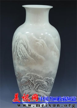 青花、玲珑、粉彩、色釉,合称景德镇四大传统名瓷,图中展示的这件粉彩《风雪夜归人》瓶出自陶瓷名家袁世文之手。这件瓷瓶色彩丰富,画工细腻,富有立体感,线条工细流畅,色彩清丽粉润,极具艺术价值。袁世文是景德镇的着名陶艺家,擅长工艺粉彩雪景山水画,袁先生生于“陶瓷世家”,其舅公汪野亭系享誉海内外的景德镇“珠山八友”之一,他从小受家庭艺术熏陶,先后跟随几位陶瓷大师学习陶瓷工艺,在陶瓷领域造诣颇深。