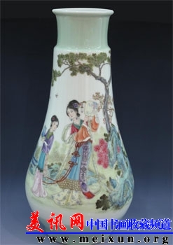 陶瓷艺术不仅仅是物质产品,而且是一种文化产品,更是一种精神产品。图中展示的这件豆青釉瓷瓶《人物游园品茶》是由景德镇陶瓷名家邹宝林所作。这件瓷瓶造型独特,淡雅柔和,色浅处淡若湖水,淡雅釉色衬托下的色彩,使瓷瓶显得更加艳丽妩媚,瓷瓶上的女子端庄典雅,可谓是将绘画与陶瓷艺术完美的结合。邹宝林是景德镇瓷器制作的代表人物,擅长粉彩人物瓷画,兼长图案、翎毛、山水瓷画,作品构思严谨、形式多样、设色浓艳,作品具有很强的艺术观赏性。