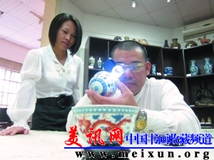 “说笑归说笑,陶瓷艺术品的保值、增值能力是有目共睹的。”曾波强借助自己一个真实经历向记者讲明这个道理:“2001年,市文物总店曾以2.8万元的价格卖出了一只清乾隆霁红釉盘,今年中,我代表文物总店出价30万元向该广东藏家回收此霁红釉盘,但藏家不愿意。哈哈,事实上,同类型盘在市场上的真正价位已经达到100万元。”