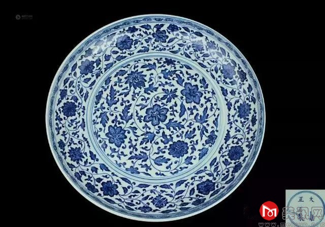 赏析:此盘敞口,浅腹,大圈足。胎体细腻坚致,通体青花纹饰,盘心缠枝莲一朵居中,周围四朵连环相绕。同时枝叶相互缠绕,统一中富含变化。缠枝纹是中国传统瓷器装饰花纹形式之一,自古帝王爱莲纹,是希望臣子如莲花般洁身自好,更是希望皇室百代连绵。绘画布局错落有致,极为精美,乃一罕见的佳品。