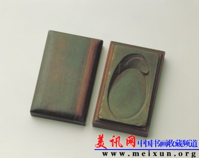 砚青石制,长方形,砚面上窄而下宽,略呈梯形,砚侧下敛,背面为平直长方形。砚略有剥蚀,显出粗糙的石质。砚面开琢椭圆形砚堂,表面光滑,与砚池相通,砚池边贴塑鱼纹,如临池观鱼,如鱼在墨藻,颇为别致。