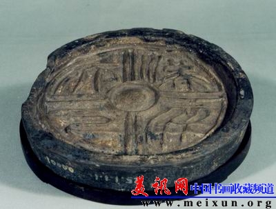 清代 “汉并天下”瓦当砚,直径15.7厘米。此砚是用汉瓦当做成,圆形,灰陶,陶质细腻坚硬。瓦当正面中心为乳突,两条平行线将圆面分为四部分,每部分一个阳文篆字,合为“汉并天下”。瓦当反面做砚堂。