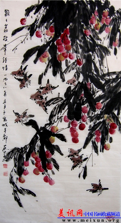 友蒸先生继承和发扬了当代文人画的传统,喜将大自然中的松、竹、梅、荷等植物入画,寓意“傲立苍穹、刚直不阿、清高超逸、出泥不染”的品质。特别是描绘农家茅舍,老百姓生活中常见的瓜果、笋菜、春桃、夏荷、秋菊、冬梅、紫藤、枇杷等四季花卉,显得“随手拈来、亲切平易、秀色可餐”,极大地表现出画家“含蓄、沉稳、敦厚、淳朴”的特质。如他画的松,棵棵拔地而矗立,虬须多节、铁杆钢针、高大挺拔、生机蓬勃,用以颂扬“浩气长存”;他描绘的红梅,在红红的一大片梅花丛中,枝杆采取挖空法(即用刀子将宣纸划破,另用宣纸粘贴,再用墨色渲染),其立体感非常强烈。这种破古人之传统,立自己之个性,既突出了寒梅怒放挺拔的特征,又寓意画家不惧风霜,傲笑江湖的高尚品质。真是“挥毫落纸染墨痕,几点梅花最可人”;他描绘的竹枝、竹叶、竹丛,远近疏密、简炼潇洒、浓淡相间、墨色苍润,似一股清雅之气扑面而来;他描绘的荷花更是青翠欲滴、笔势洒脱、墨韵纵横,醉心于这种植物“出泥不染”的自然属性,赋予君子似的人格魅力,使画幅的内涵极为丰富。